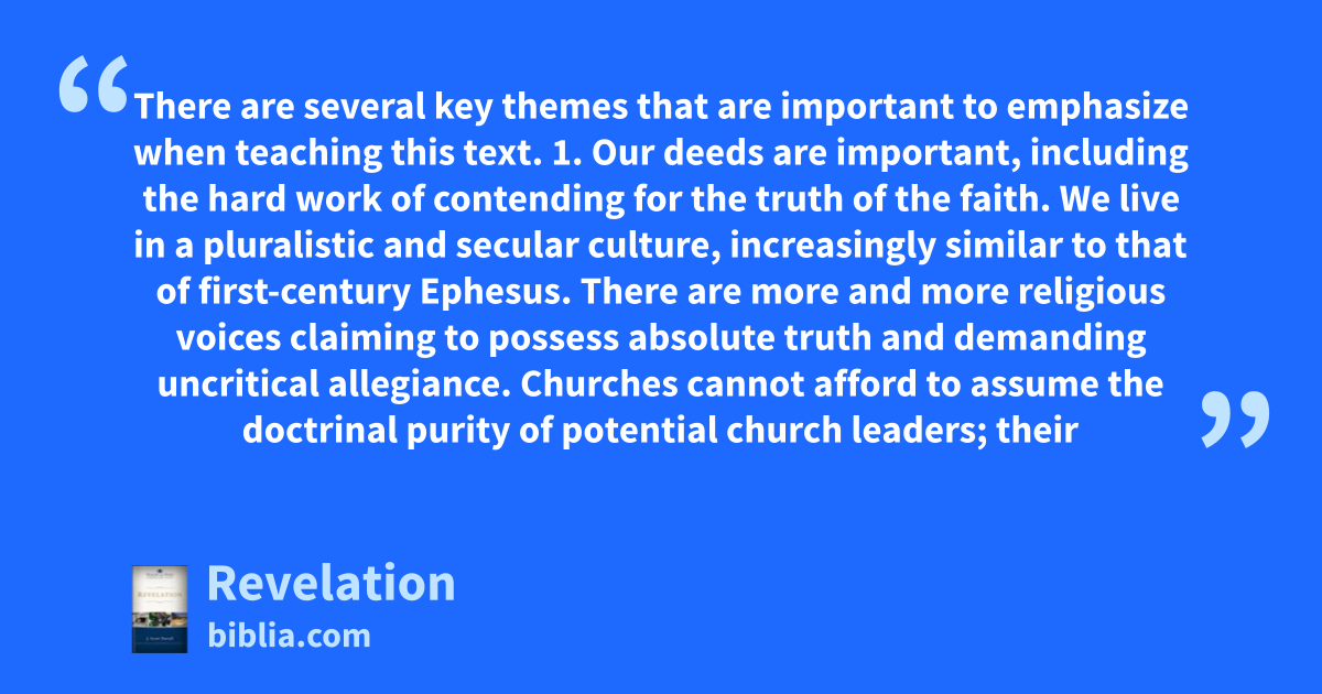 There are several key themes that are important to emphasize when teaching this text. 1. Our deeds are important, including the hard work of contending for the truth of the faith. We live in a pluralistic and secular culture, increasingly similar to that of first-century Ephesus. There are more and more religious voices claiming to possess absolute truth and demanding uncritical allegiance. Churches cannot afford to assume the doctrinal purity of potential church leaders; their