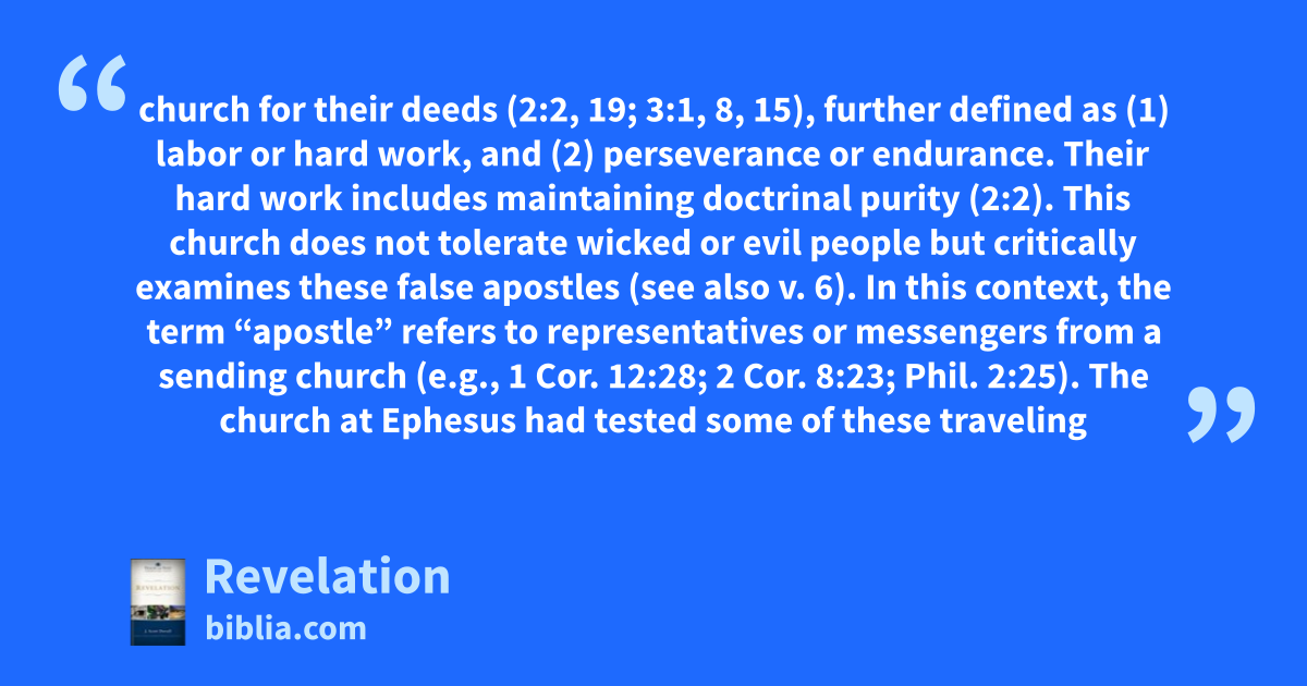 church for their deeds (2:2, 19; 3:1, 8, 15), further defined as (1) labor or hard work, and (2) perseverance or endurance. Their hard work includes maintaining doctrinal purity (2:2). This church does not tolerate wicked or evil people but critically examines these false apostles (see also v. 6). In this context, the term “apostle” refers to representatives or messengers from a sending church (e.g., 1 Cor. 12:28; 2 Cor. 8:23; Phil. 2:25). The church at Ephesus had tested some of these traveling