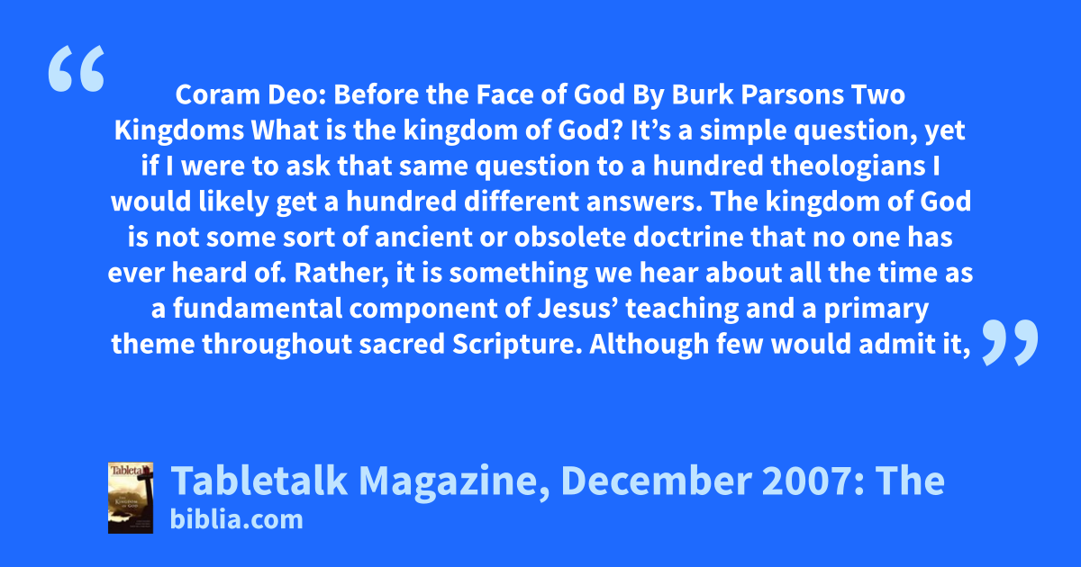 Possibly no other theme has generated as much debate as the kingdom of God. What is it? When will it arrive? Has it already? In what way? Who are its recipients? And the list goes on. This issue of Tabletalk, however, will not be entertaining such question in any great detail, for it is our desire to share with our readers some of the sweeping themes found in Scripture regarding God’s kingdom —...