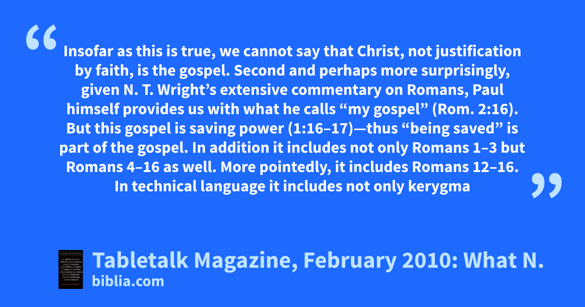 Insofar as this is true, we cannot say that Christ, not justification by faith, is the gospel. Second and perhaps more surprisingly, given N. T. Wright’s extensive commentary on Romans, Paul himself provides us with what he calls “my gospel” (Rom. 2:16). But this gospel is saving power (1:16–17)—thus “being saved” is part of the gospel. In addition it includes not only Romans 1–3 but Romans 4–16 as well. More pointedly, it includes Romans 12–16. In technical language it includes not only kerygma