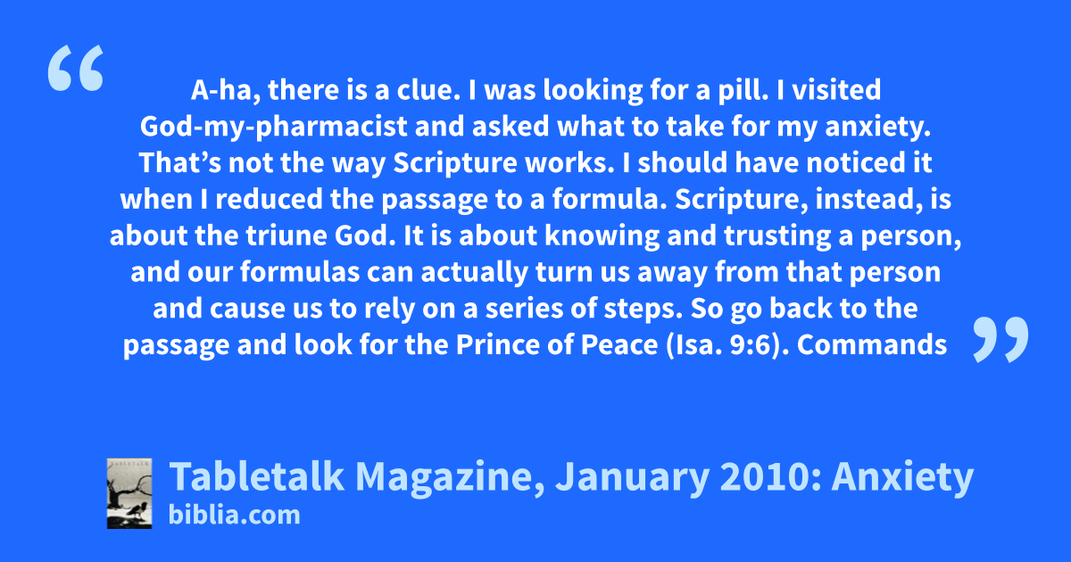 A-ha, there is a clue. I was looking for a pill. I visited God-my-pharmacist and asked what to take for my anxiety. That’s not the way Scripture works. I should have noticed it when I reduced the passage to a formula. Scripture, instead, is about the triune God. It is about knowing and trusting a person, and our formulas can actually turn us away from that person and cause us to rely on a series of steps. So go back to the passage and look for the Prince of Peace (Isa. 9:6). Commands