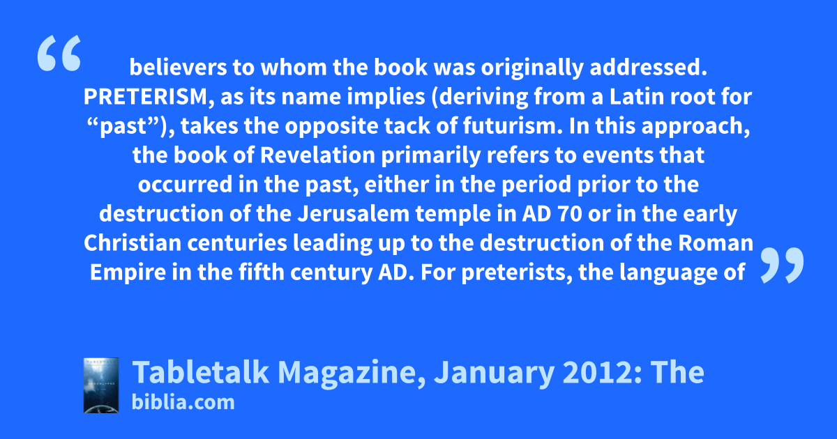 believers to whom the book was originally addressed. PRETERISM, as its name implies (deriving from a Latin root for “past”), takes the opposite tack of futurism. In this approach, the book of Revelation primarily refers to events that occurred in the past, either in the period prior to the destruction of the Jerusalem temple in AD 70 or in the early Christian centuries leading up to the destruction of the Roman Empire in the fifth century AD. For preterists, the language of