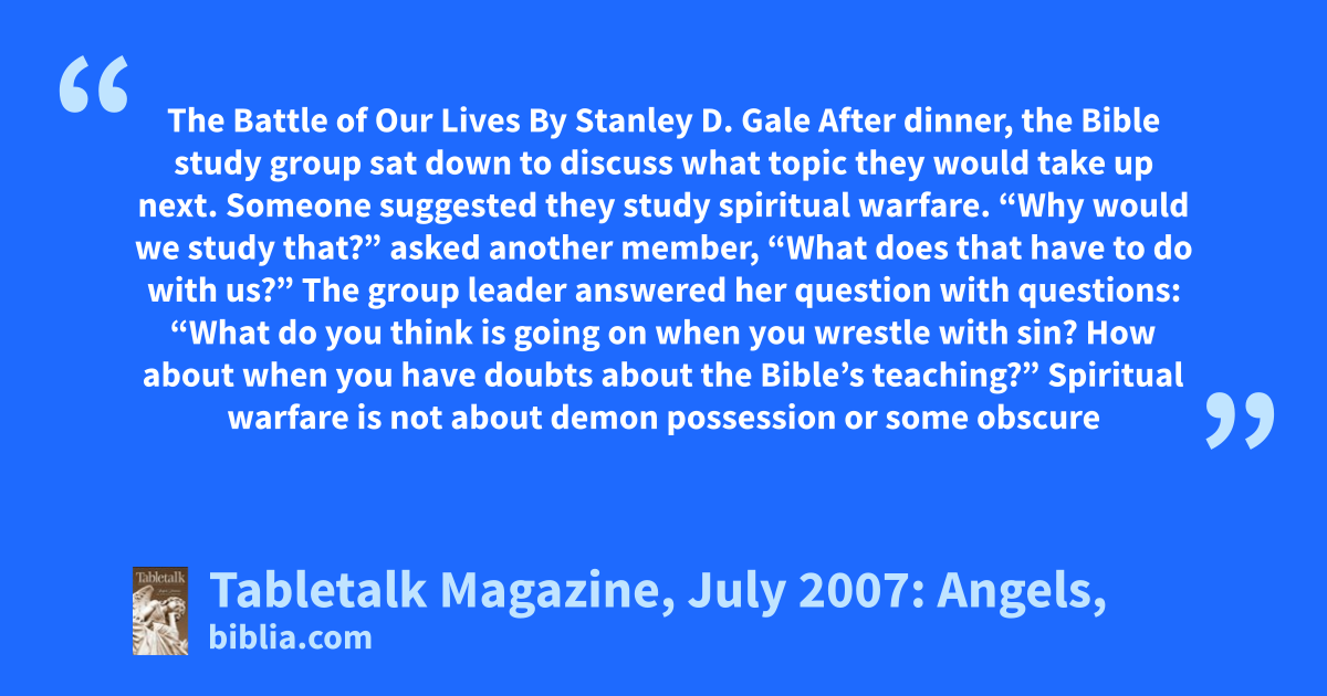 The Battle of Our Lives By Stanley D. Gale After dinner, the Bible study group sat down to discuss what topic they would take up next. Someone suggested they study spiritual warfare. “Why would we study that?” asked another member, “What does that have to do with us?” The group leader answered her question with questions: “What do you think is going on when you wrestle with sin? How about when you have doubts about the Bible’s teaching?” Spiritual warfare is not about demon possession or some obscure