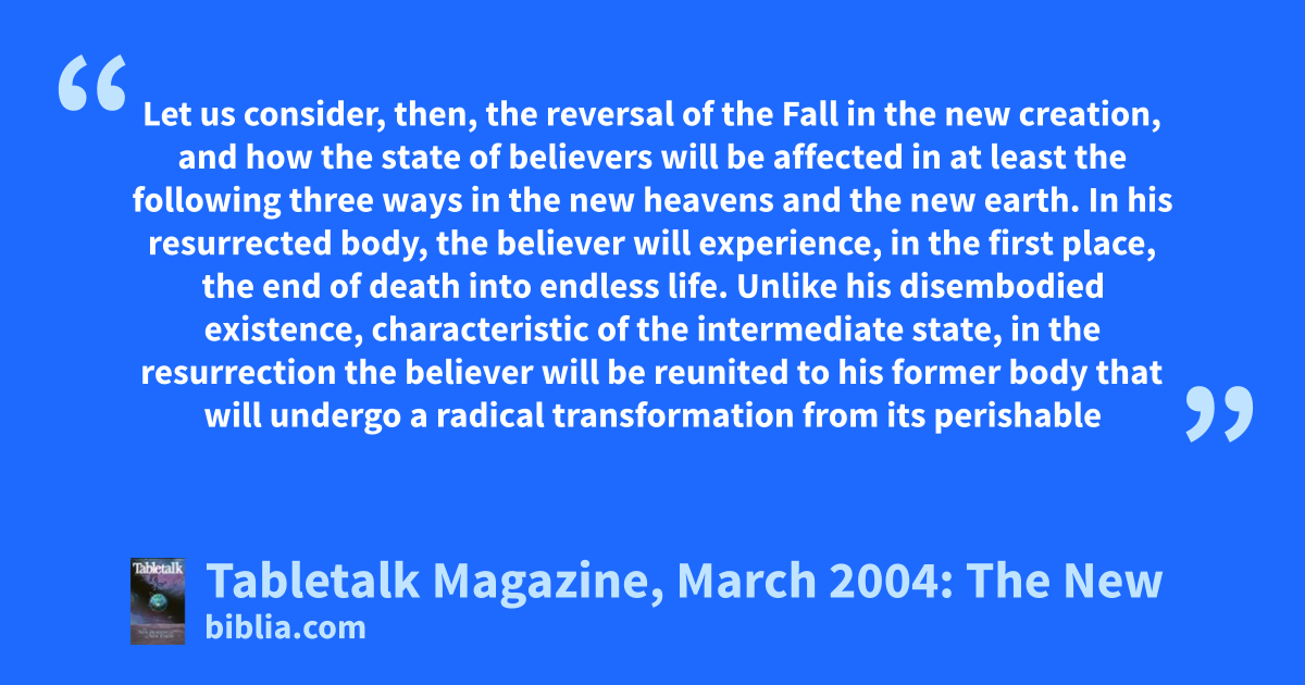 Let us consider, then, the reversal of the Fall in the new creation, and how the state of believers will be affected in at least the following three ways in the new heavens and the new earth. In his resurrected body, the believer will experience, in the first place, the end of death into endless life. Unlike his disembodied existence, characteristic of the intermediate state, in the resurrection the believer will be reunited to his former body that will undergo a radical transformation from its perishable