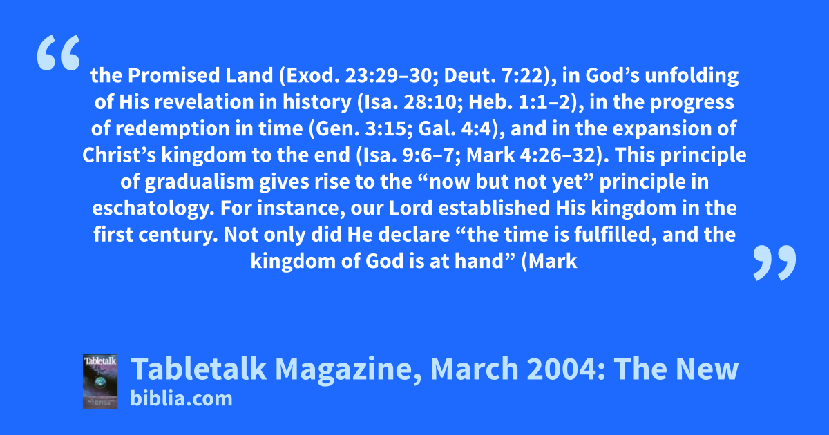the Promised Land (Exod. 23:29–30; Deut. 7:22), in God’s unfolding of His revelation in history (Isa. 28:10; Heb. 1:1–2), in the progress of redemption in time (Gen. 3:15; Gal. 4:4), and in the expansion of Christ’s kingdom to the end (Isa. 9:6–7; Mark 4:26–32). This principle of gradualism gives rise to the “now but not yet” principle in eschatology. For instance, our Lord established His kingdom in the first century. Not only did He declare “the time is fulfilled, and the kingdom of God is at hand” (Mark