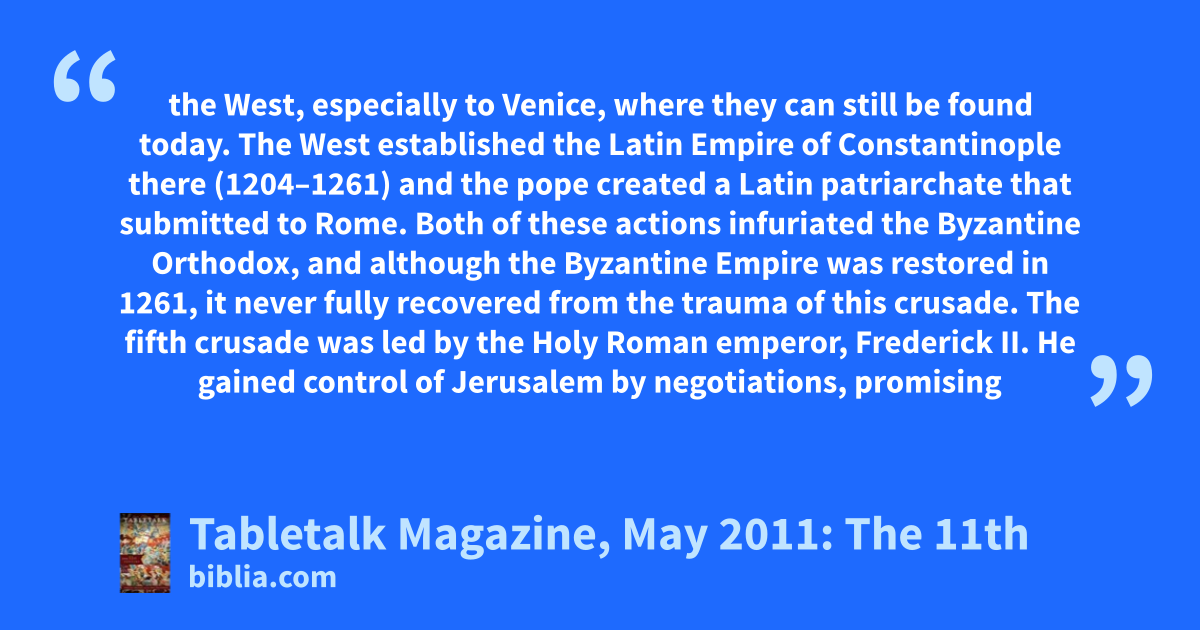 the West, especially to Venice, where they can still be found today. The West established the Latin Empire of Constantinople there (1204–1261) and the pope created a Latin patriarchate that submitted to Rome. Both of these actions infuriated the Byzantine Orthodox, and although the Byzantine Empire was restored in 1261, it never fully recovered from the trauma of this crusade. The fifth crusade was led by the Holy Roman emperor, Frederick II. He gained control of Jerusalem by negotiations, promising