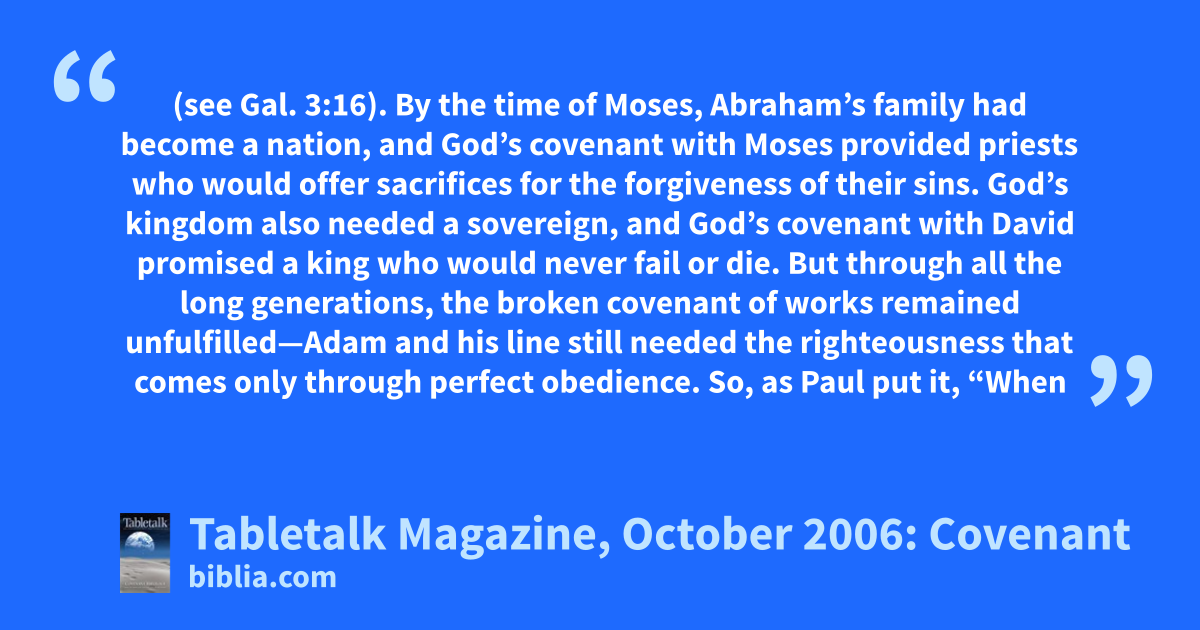 (see Gal. 3:16). By the time of Moses, Abraham’s family had become a nation, and God’s covenant with Moses provided priests who would offer sacrifices for the forgiveness of their sins. God’s kingdom also needed a sovereign, and God’s covenant with David promised a king who would never fail or die. But through all the long generations, the broken covenant of works remained unfulfilled—Adam and his line still needed the righteousness that comes only through perfect obedience. So, as Paul put it, “When