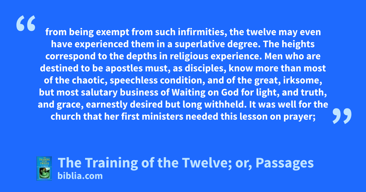from being exempt from such infirmities, the twelve may even have experienced them in a superlative degree. The heights correspond to the depths in religious experience. Men who are destined to be apostles must, as disciples, know more than most of the chaotic, speechless condition, and of the great, irksome, but most salutary business of Waiting on God for light, and truth, and grace, earnestly desired but long withheld. It was well for the church that her first ministers needed this lesson on prayer;