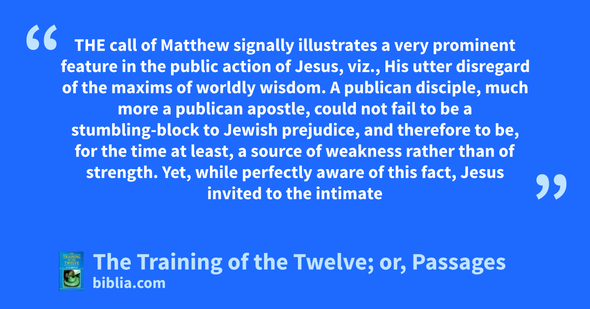 THE call of Matthew signally illustrates a very prominent feature in the public action of Jesus, viz., His utter disregard of the maxims of worldly wisdom. A publican disciple, much more a publican apostle, could not fail to be a stumbling-block to Jewish prejudice, and therefore to be, for the time at least, a source of weakness rather than of strength. Yet, while perfectly aware of this fact, Jesus invited to the intimate
