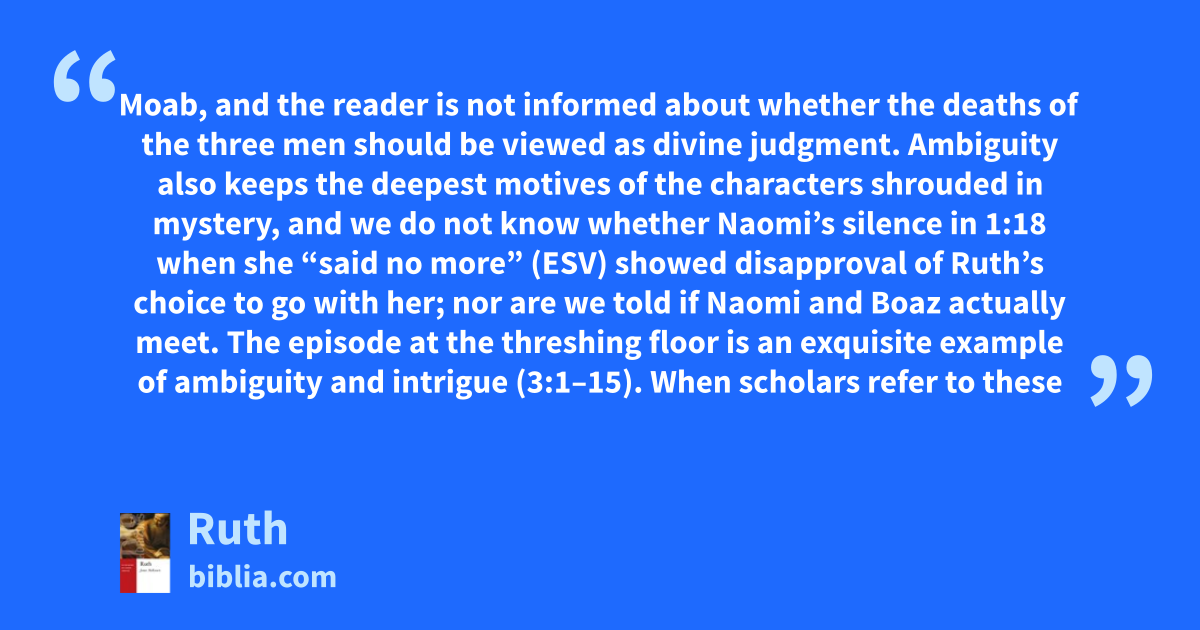 Moab, and the reader is not informed about whether the deaths of the three men should be viewed as divine judgment. Ambiguity also keeps the deepest motives of the characters shrouded in mystery, and we do not know whether Naomi’s silence in 1:18 when she “said no more” (ESV) showed disapproval of Ruth’s choice to go with her; nor are we told if Naomi and Boaz actually meet. The episode at the threshing floor is an exquisite example of ambiguity and intrigue (3:1–15). When scholars refer to these