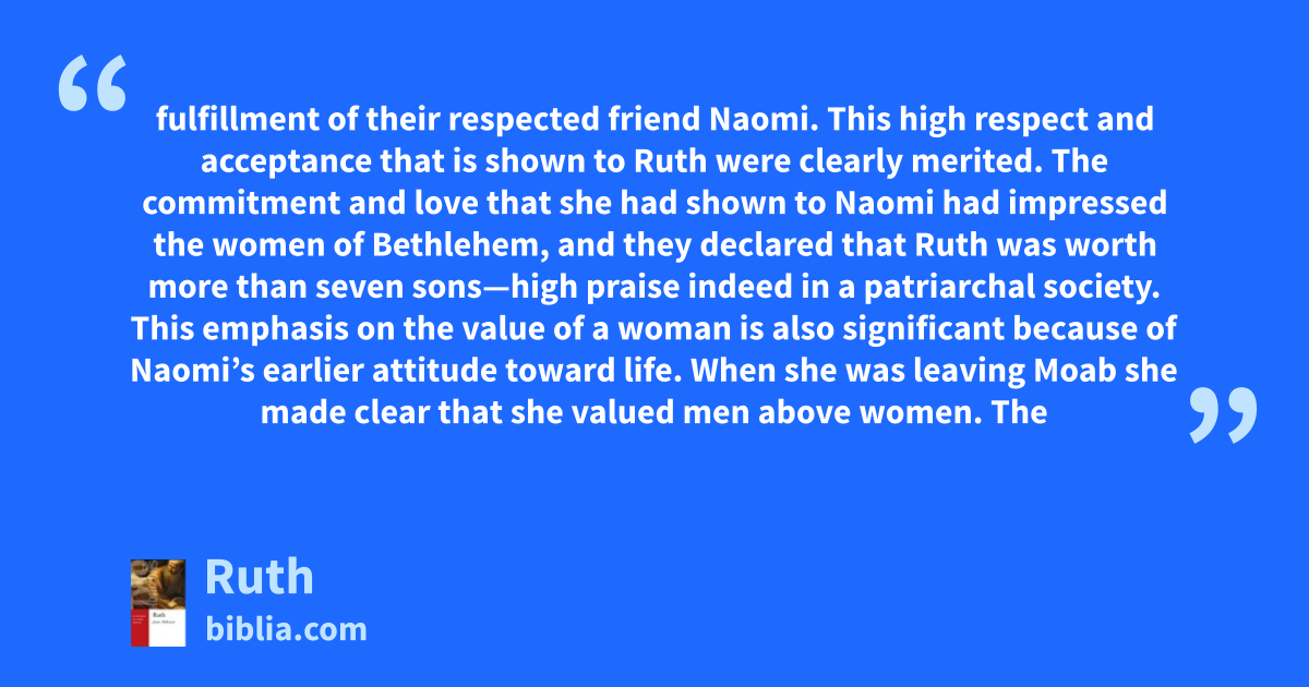 fulfillment of their respected friend Naomi. This high respect and acceptance that is shown to Ruth were clearly merited. The commitment and love that she had shown to Naomi had impressed the women of Bethlehem, and they declared that Ruth was worth more than seven sons—high praise indeed in a patriarchal society. This emphasis on the value of a woman is also significant because of Naomi’s earlier attitude toward life. When she was leaving Moab she made clear that she valued men above women. The
