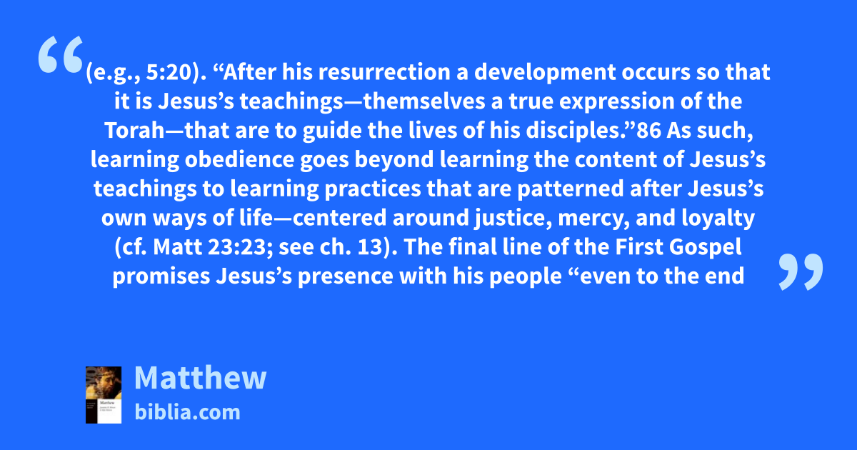 (e.g., 5:20). “After his resurrection a development occurs so that it is Jesus’s teachings—themselves a true expression of the Torah—that are to guide the lives of his disciples.”86 As such, learning obedience goes beyond learning the content of Jesus’s teachings to learning practices that are patterned after Jesus’s own ways of life—centered around justice, mercy, and loyalty (cf. Matt 23:23; see ch. 13). The final line of the First Gospel promises Jesus’s presence with his people “even to the end