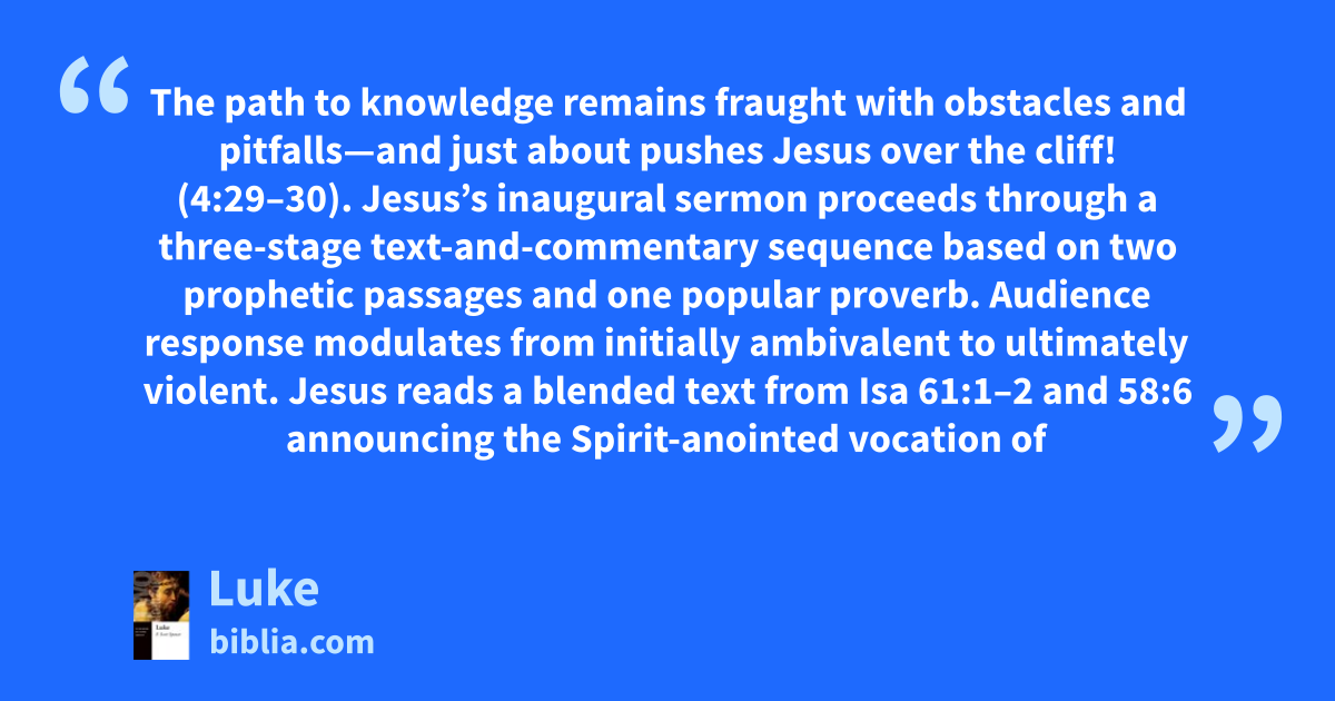 The path to knowledge remains fraught with obstacles and pitfalls—and just about pushes Jesus over the cliff! (4:29–30). Jesus’s inaugural sermon proceeds through a three-stage text-and-commentary sequence based on two prophetic passages and one popular proverb. Audience response modulates from initially ambivalent to ultimately violent. Jesus reads a blended text from Isa 61:1–2 and 58:6 announcing the Spirit-anointed vocation of