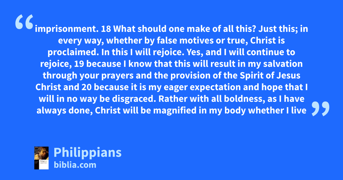 imprisonment. 18 What should one make of all this? Just this; in every way, whether by false motives or true, Christ is proclaimed. In this I will rejoice. Yes, and I will continue to rejoice, 19 because I know that this will result in my salvation through your prayers and the provision of the Spirit of Jesus Christ and 20 because it is my eager expectation and hope that I will in no way be disgraced. Rather with all boldness, as I have always done, Christ will be magnified in my body whether I live