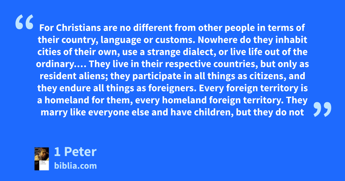 For Christians are no different from other people in terms of their country, language or customs. Nowhere do they inhabit cities of their own, use a strange dialect, or live life out of the ordinary.… They live in their respective countries, but only as resident aliens; they participate in all things as citizens, and they endure all things as foreigners. Every foreign territory is a homeland for them, every homeland foreign territory. They marry like everyone else and have children, but they do not