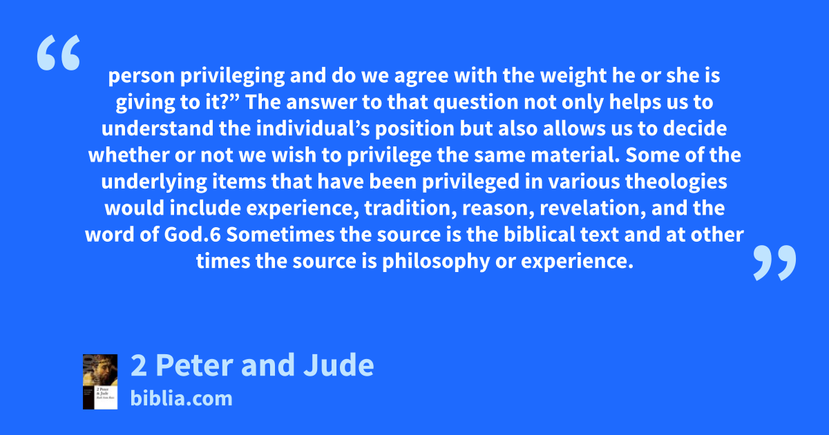 person privileging and do we agree with the weight he or she is giving to it?” The answer to that question not only helps us to understand the individual’s position but also allows us to decide whether or not we wish to privilege the same material. Some of the underlying items that have been privileged in various theologies would include experience, tradition, reason, revelation, and the word of God.6 Sometimes the source is the biblical text and at other times the source is philosophy or experience.