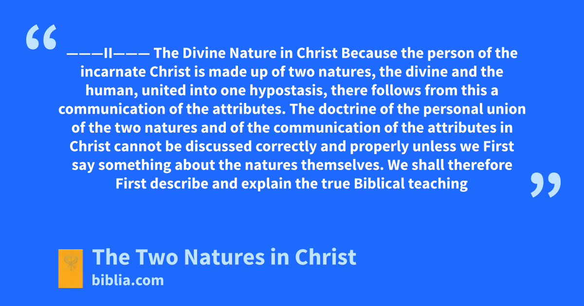 ———II——— The Divine Nature in Christ Because the person of the incarnate Christ is made up of two natures, the divine and the human, united into one hypostasis, there follows from this a communication of the attributes. The doctrine of the personal union of the two natures and of the communication of the attributes in Christ cannot be discussed correctly and properly unless we First say something about the natures themselves. We shall therefore First describe and explain the true Biblical teaching