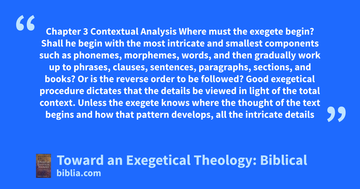 Chapter 3 Contextual Analysis Where must the exegete begin? Shall he begin with the most intricate and smallest components such as phonemes, morphemes, words, and then gradually work up to phrases, clauses, sentences, paragraphs, sections, and books? Or is the reverse order to be followed? Good exegetical procedure dictates that the details be viewed in light of the total context. Unless the exegete knows where the thought of the text begins and how that pattern develops, all the intricate details