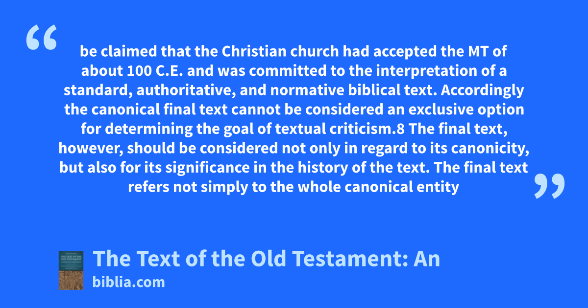 be claimed that the Christian church had accepted the MT of about 100 C.E. and was committed to the interpretation of a standard, authoritative, and normative biblical text. Accordingly the canonical final text cannot be considered an exclusive option for determining the goal of textual criticism.8 The final text, however, should be considered not only in regard to its canonicity, but also for its significance in the history of the text. The final text refers not simply to the whole canonical entity
