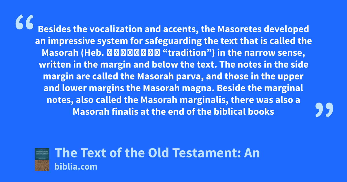 Besides the vocalization and accents, the Masoretes developed an impressive system for safeguarding the text that is called the Masorah (Heb. מַסֹּרָה “tradition”) in the narrow sense, written in the margin and below the text. The notes in the side margin are called the Masorah parva, and those in the upper and lower margins the Masorah magna. Beside the marginal notes, also called the Masorah marginalis, there was also a Masorah finalis at the end of the biblical books