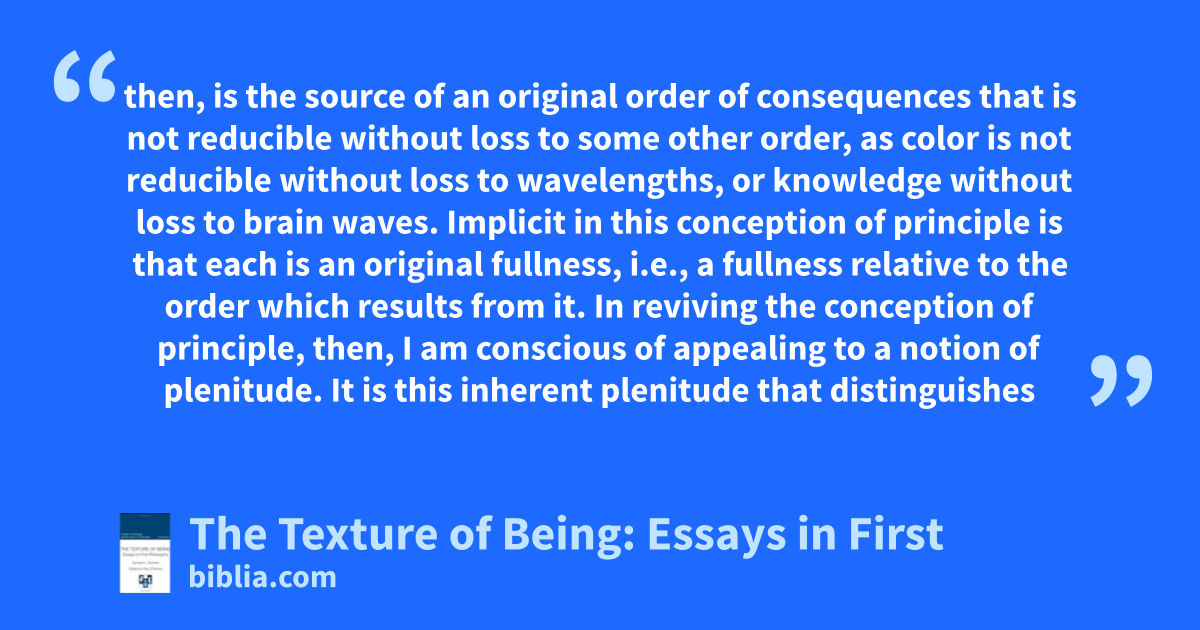 then, is the source of an original order of consequences that is not reducible without loss to some other order, as color is not reducible without loss to wavelengths, or knowledge without loss to brain waves. Implicit in this conception of principle is that each is an original fullness, i.e., a fullness relative to the order which results from it. In reviving the conception of principle, then, I am conscious of appealing to a notion of plenitude. It is this inherent plenitude that distinguishes