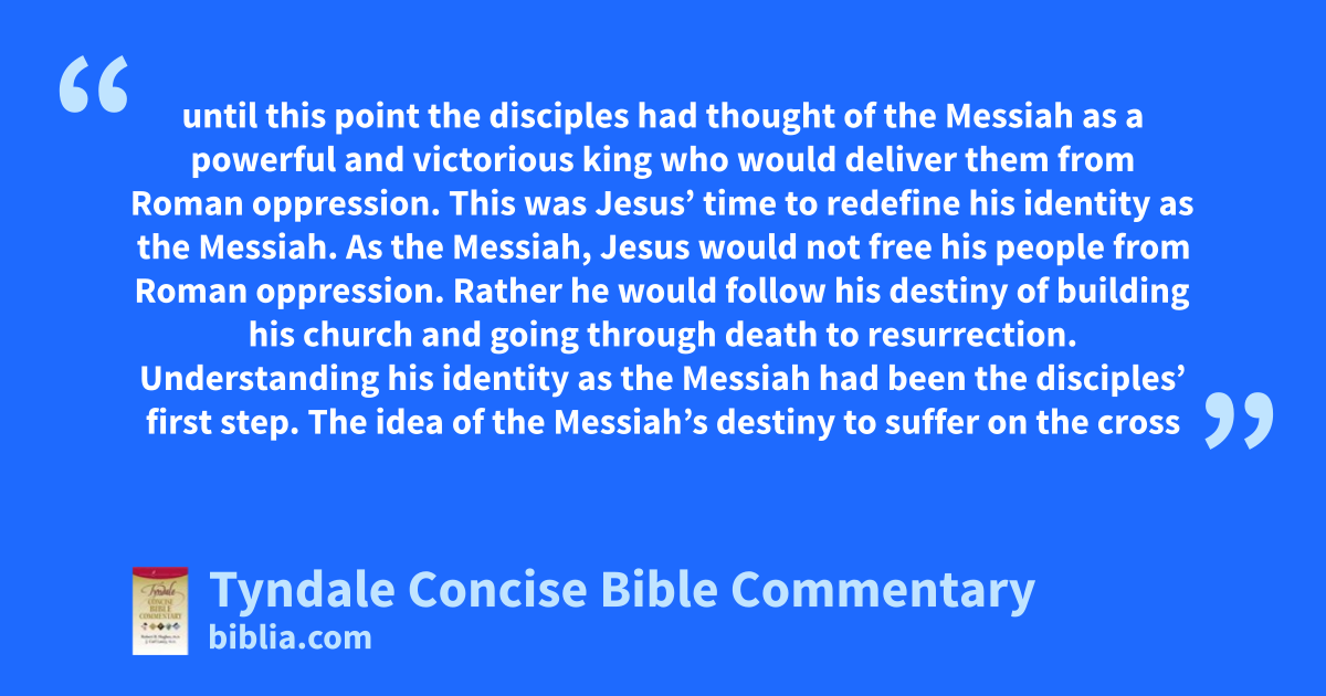 until this point the disciples had thought of the Messiah as a powerful and victorious king who would deliver them from Roman oppression. This was Jesus’ time to redefine his identity as the Messiah. As the Messiah, Jesus would not free his people from Roman oppression. Rather he would follow his destiny of building his church and going through death to resurrection. Understanding his identity as the Messiah had been the disciples’ first step. The idea of the Messiah’s destiny to suffer on the cross