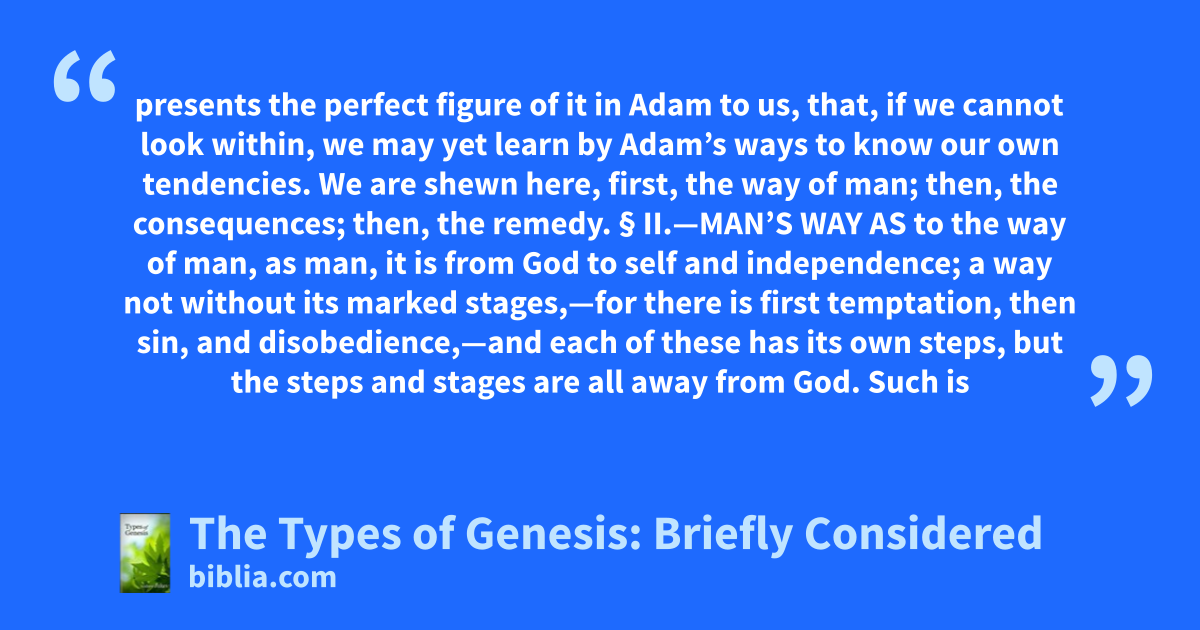 presents the perfect figure of it in Adam to us, that, if we cannot look within, we may yet learn by Adam’s ways to know our own tendencies. We are shewn here, first, the way of man; then, the consequences; then, the remedy. § II.—MAN’S WAY AS to the way of man, as man, it is from God to self and independence; a way not without its marked stages,—for there is first temptation, then sin, and disobedience,—and each of these has its own steps, but the steps and stages are all away from God. Such is