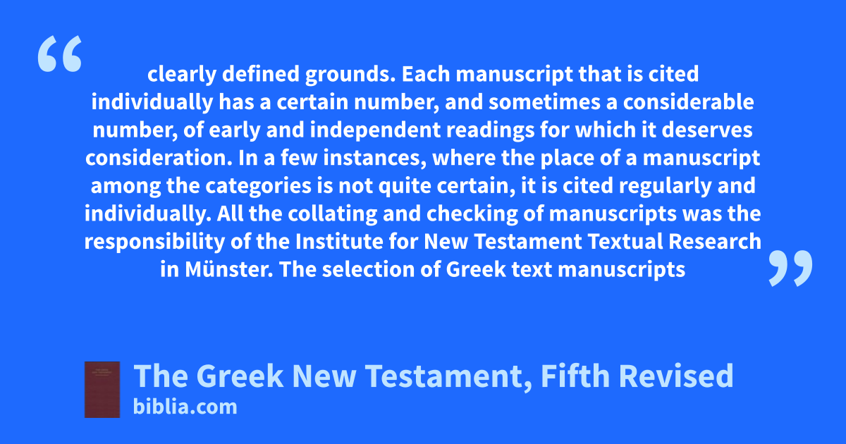 clearly defined grounds. Each manuscript that is cited individually has a certain number, and sometimes a considerable number, of early and independent readings for which it deserves consideration. In a few instances, where the place of a manuscript among the categories is not quite certain, it is cited regularly and individually. All the collating and checking of manuscripts was the responsibility of the Institute for New Testament Textual Research in Münster. The selection of Greek text manuscripts