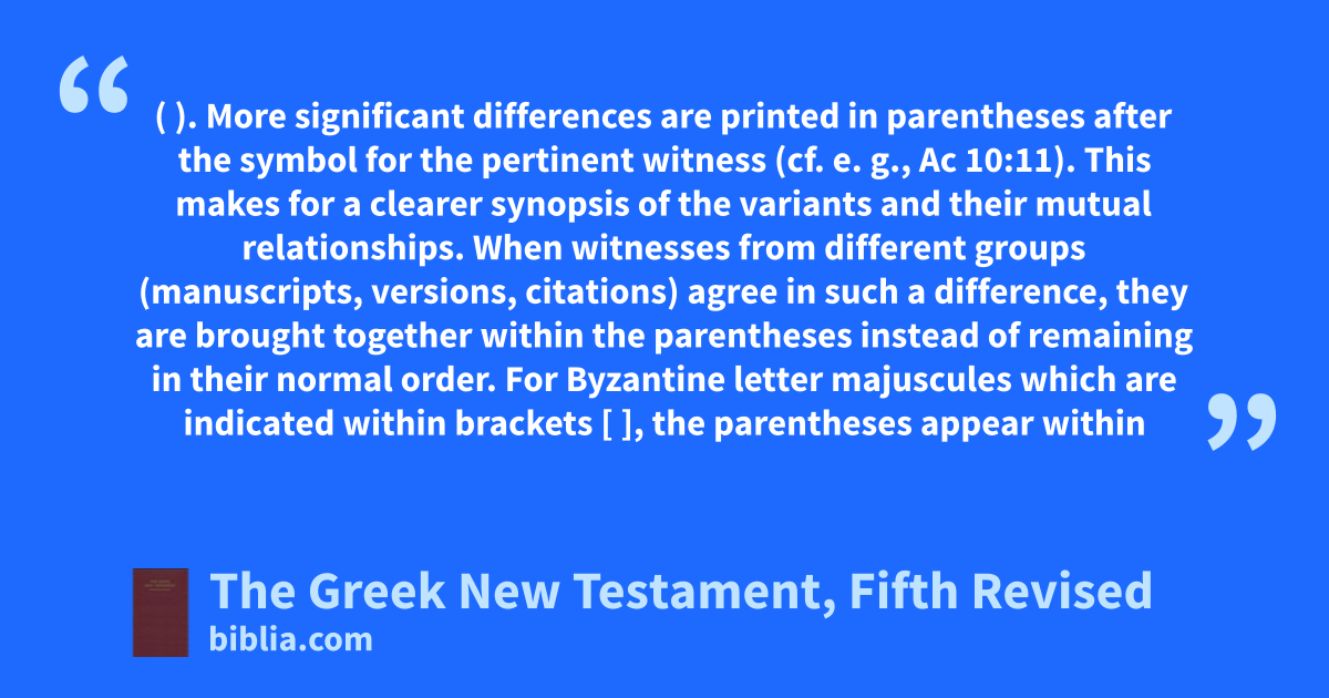 The Greek New Testament, Fifth Edition is designed for translators and students. Like NA28, this is the leading edition of the original text of the New Testament. It contains the same Greek text as NA28, differing only in some details of punctuation and paragraphing. The critical apparatus includes exegetically significant variants (fewer than NA28) but adds extensive manuscript evidence (more...