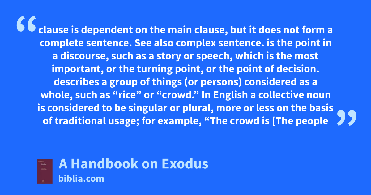 clause is dependent on the main clause, but it does not form a complete sentence. See also complex sentence. is the point in a discourse, such as a story or speech, which is the most important, or the turning point, or the point of decision. describes a group of things (or persons) considered as a whole, such as “rice” or “crowd.” In English a collective noun is considered to be singular or plural, more or less on the basis of traditional usage; for example, “The crowd is [The people