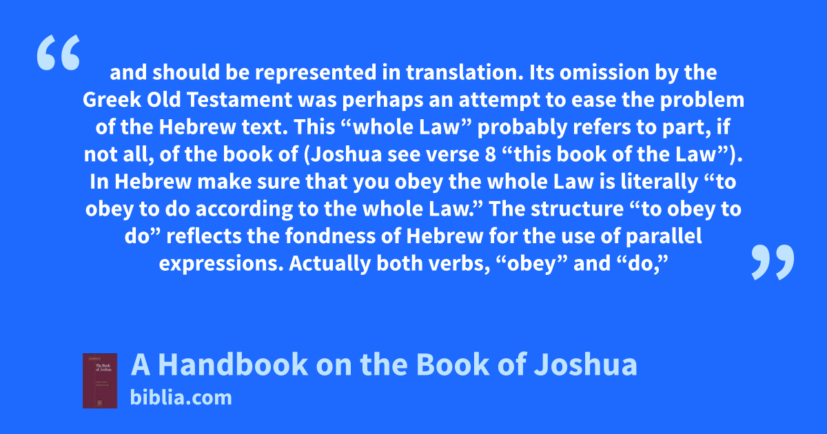and should be represented in translation. Its omission by the Greek Old Testament was perhaps an attempt to ease the problem of the Hebrew text. This “whole Law” probably refers to part, if not all, of the book of (Joshua see verse 8 “this book of the Law”). In Hebrew make sure that you obey the whole Law is literally “to obey to do according to the whole Law.” The structure “to obey to do” reflects the fondness of Hebrew for the use of parallel expressions. Actually both verbs, “obey” and “do,”
