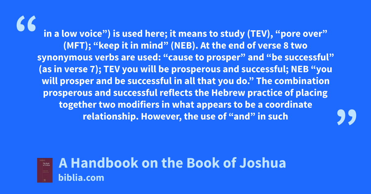in a low voice”) is used here; it means to study (TEV), “pore over” (MFT); “keep it in mind” (NEB). At the end of verse 8 two synonymous verbs are used: “cause to prosper” and “be successful” (as in verse 7); TEV you will be prosperous and successful; NEB “you will prosper and be successful in all that you do.” The combination prosperous and successful reflects the Hebrew practice of placing together two modifiers in what appears to be a coordinate relationship. However, the use of “and” in such