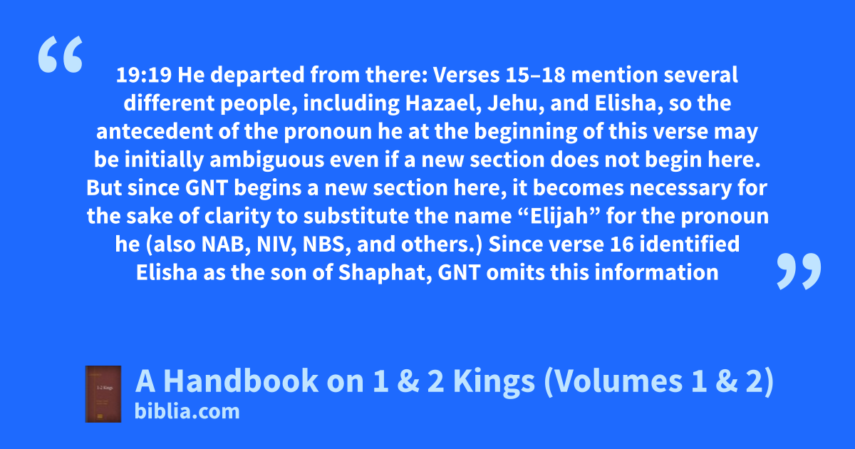 19:19 He departed from there: Verses 15–18 mention several different people, including Hazael, Jehu, and Elisha, so the antecedent of the pronoun he at the beginning of this verse may be initially ambiguous even if a new section does not begin here. But since GNT begins a new section here, it becomes necessary for the sake of clarity to substitute the name “Elijah” for the pronoun he (also NAB, NIV, NBS, and others.) Since verse 16 identified Elisha as the son of Shaphat, GNT omits this information