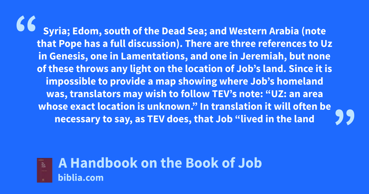 Syria; Edom, south of the Dead Sea; and Western Arabia (note that Pope has a full discussion). There are three references to Uz in Genesis, one in Lamentations, and one in Jeremiah, but none of these throws any light on the location of Job’s land. Since it is impossible to provide a map showing where Job’s homeland was, translators may wish to follow TEV’s note: “UZ: an area whose exact location is unknown.” In translation it will often be necessary to say, as TEV does, that Job “lived in the land
