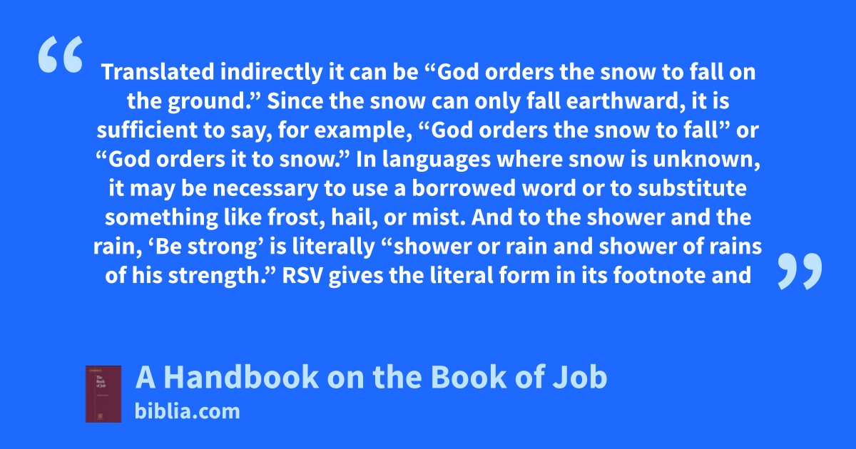 Translated indirectly it can be “God orders the snow to fall on the ground.” Since the snow can only fall earthward, it is sufficient to say, for example, “God orders the snow to fall” or “God orders it to snow.” In languages where snow is unknown, it may be necessary to use a borrowed word or to substitute something like frost, hail, or mist. And to the shower and the rain, ‘Be strong’ is literally “shower or rain and shower of rains of his strength.” RSV gives the literal form in its footnote and