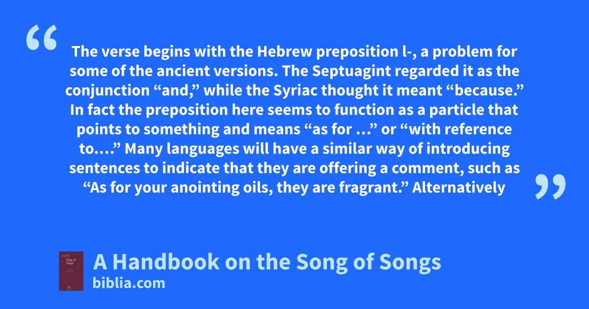 The verse begins with the Hebrew preposition l-, a problem for some of the ancient versions. The Septuagint regarded it as the conjunction “and,” while the Syriac thought it meant “because.” In fact the preposition here seems to function as a particle that points to something and means “as for …” or “with reference to.…” Many languages will have a similar way of introducing sentences to indicate that they are offering a comment, such as “As for your anointing oils, they are fragrant.” Alternatively
