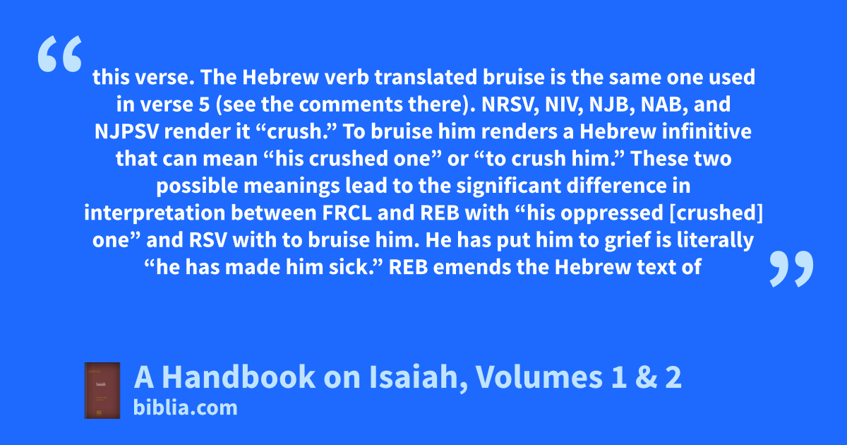this verse. The Hebrew verb translated bruise is the same one used in verse 5 (see the comments there). NRSV, NIV, NJB, NAB, and NJPSV render it “crush.” To bruise him renders a Hebrew infinitive that can mean “his crushed one” or “to crush him.” These two possible meanings lead to the significant difference in interpretation between FRCL and REB with “his oppressed [crushed] one” and RSV with to bruise him. He has put him to grief is literally “he has made him sick.” REB emends the Hebrew text of