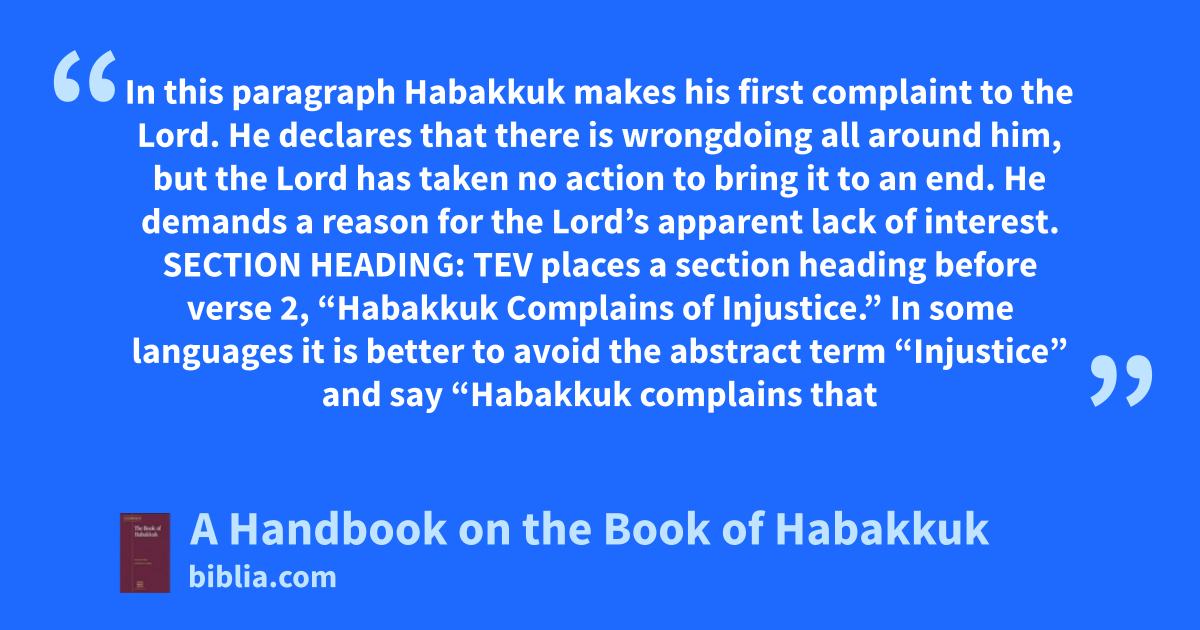 In this paragraph Habakkuk makes his first complaint to the Lord. He declares that there is wrongdoing all around him, but the Lord has taken no action to bring it to an end. He demands a reason for the Lord’s apparent lack of interest. SECTION HEADING: TEV places a section heading before verse 2, “Habakkuk Complains of Injustice.” In some languages it is better to avoid the abstract term “Injustice” and say “Habakkuk complains that