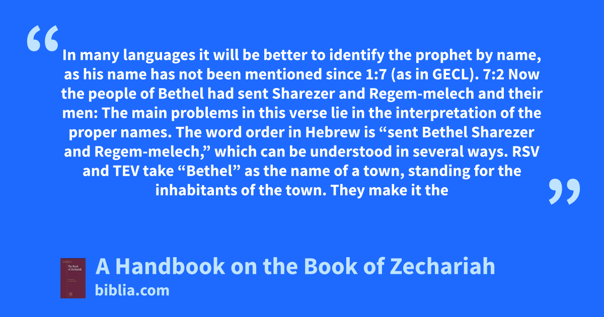 In many languages it will be better to identify the prophet by name, as his name has not been mentioned since 1:7 (as in GECL). 7:2 Now the people of Bethel had sent Sharezer and Regem-melech and their men: The main problems in this verse lie in the interpretation of the proper names. The word order in Hebrew is “sent Bethel Sharezer and Regem-melech,” which can be understood in several ways. RSV and TEV take “Bethel” as the name of a town, standing for the inhabitants of the town. They make it the
