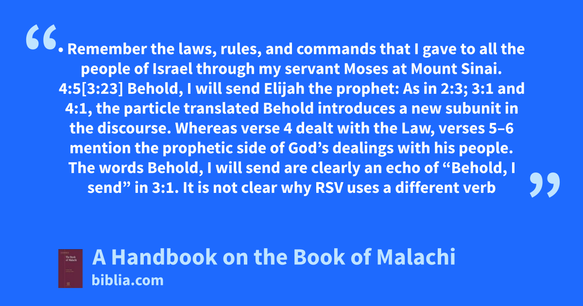 • Remember the laws, rules, and commands that I gave to all the people of Israel through my servant Moses at Mount Sinai. 4:5[3:23] Behold, I will send Elijah the prophet: As in 2:3; 3:1 and 4:1, the particle translated Behold introduces a new subunit in the discourse. Whereas verse 4 dealt with the Law, verses 5–6 mention the prophetic side of God’s dealings with his people. The words Behold, I will send are clearly an echo of “Behold, I send” in 3:1. It is not clear why RSV uses a different verb