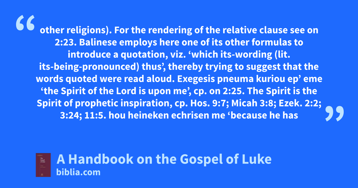 other religions). For the rendering of the relative clause see on 2:23. Balinese employs here one of its other formulas to introduce a quotation, viz. ‘which its-wording (lit. its-being-pronounced) thus’, thereby trying to suggest that the words quoted were read aloud. Exegesis pneuma kuriou ep’ eme ‘the Spirit of the Lord is upon me’, cp. on 2:25. The Spirit is the Spirit of prophetic inspiration, cp. Hos. 9:7; Micah 3:8; Ezek. 2:2; 3:24; 11:5. hou heineken echrisen me ‘because he has