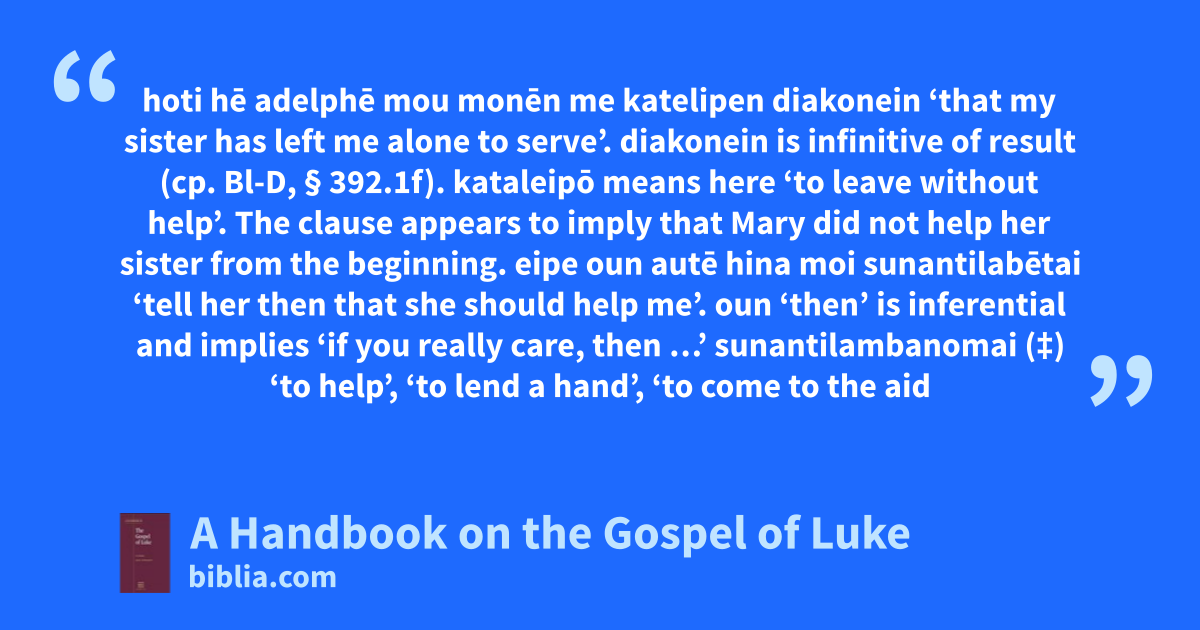 hoti hē adelphē mou monēn me katelipen diakonein ‘that my sister has left me alone to serve’. diakonein is infinitive of result (cp. Bl-D, § 392.1f). kataleipō means here ‘to leave without help’. The clause appears to imply that Mary did not help her sister from the beginning. eipe oun autē hina moi sunantilabētai ‘tell her then that she should help me’. oun ‘then’ is inferential and implies ‘if you really care, then …’ sunantilambanomai (‡) ‘to help’, ‘to lend a hand’, ‘to come to the aid