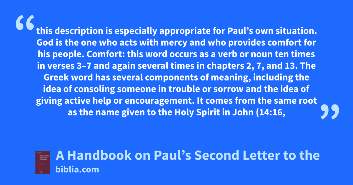 this description is especially appropriate for Paul’s own situation. God is the one who acts with mercy and who provides comfort for his people. Comfort: this word occurs as a verb or noun ten times in verses 3–7 and again several times in chapters 2, 7, and 13. The Greek word has several components of meaning, including the idea of consoling someone in trouble or sorrow and the idea of giving active help or encouragement. It comes from the same root as the name given to the Holy Spirit in John (14:16,