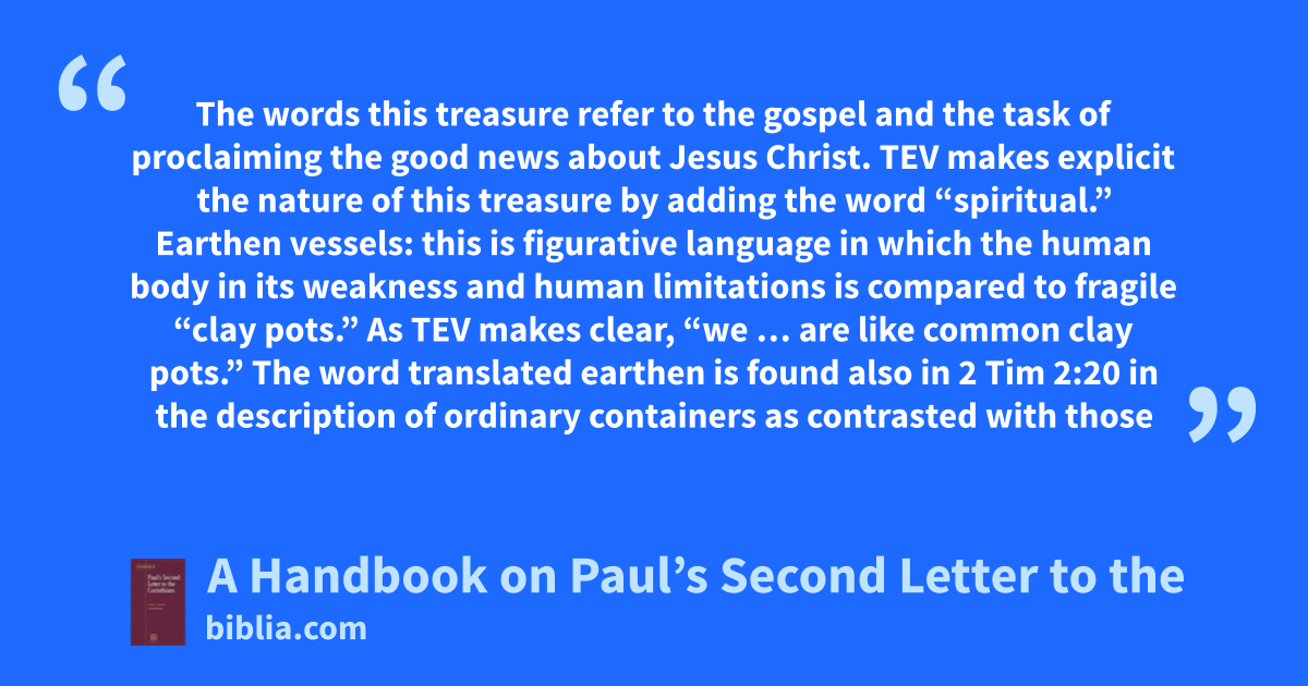 The words this treasure refer to the gospel and the task of proclaiming the good news about Jesus Christ. TEV makes explicit the nature of this treasure by adding the word “spiritual.” Earthen vessels: this is figurative language in which the human body in its weakness and human limitations is compared to fragile “clay pots.” As TEV makes clear, “we … are like common clay pots.” The word translated earthen is found also in 2 Tim 2:20 in the description of ordinary containers as contrasted with those