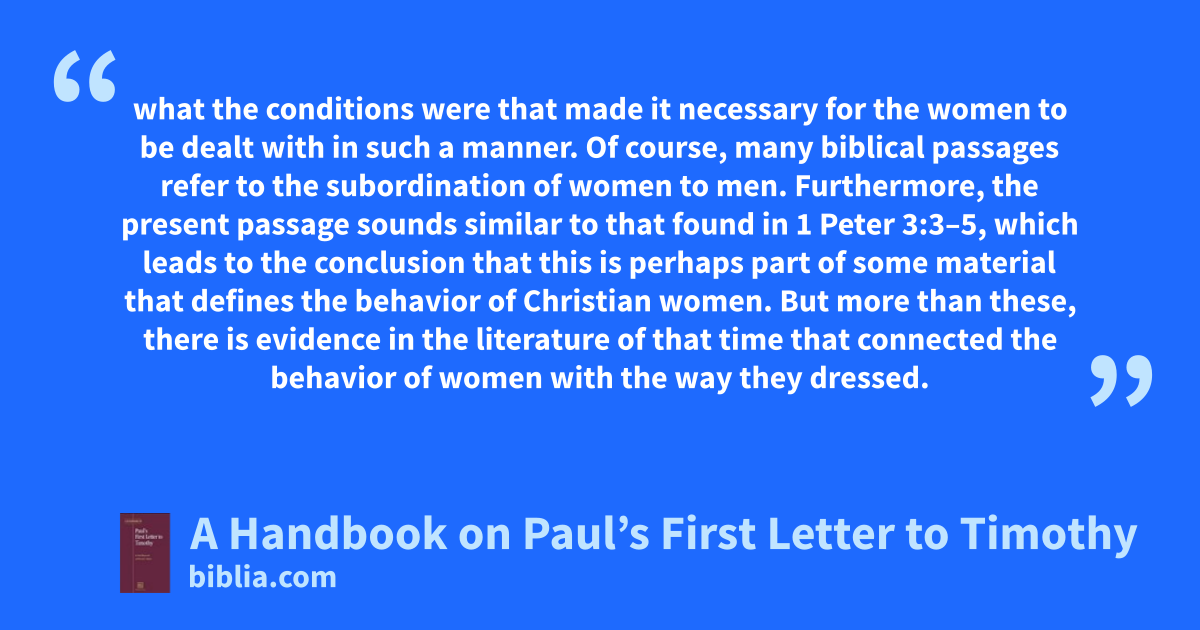 what the conditions were that made it necessary for the women to be dealt with in such a manner. Of course, many biblical passages refer to the subordination of women to men. Furthermore, the present passage sounds similar to that found in 1 Peter 3:3–5, which leads to the conclusion that this is perhaps part of some material that defines the behavior of Christian women. But more than these, there is evidence in the literature of that time that connected the behavior of women with the way they dressed.