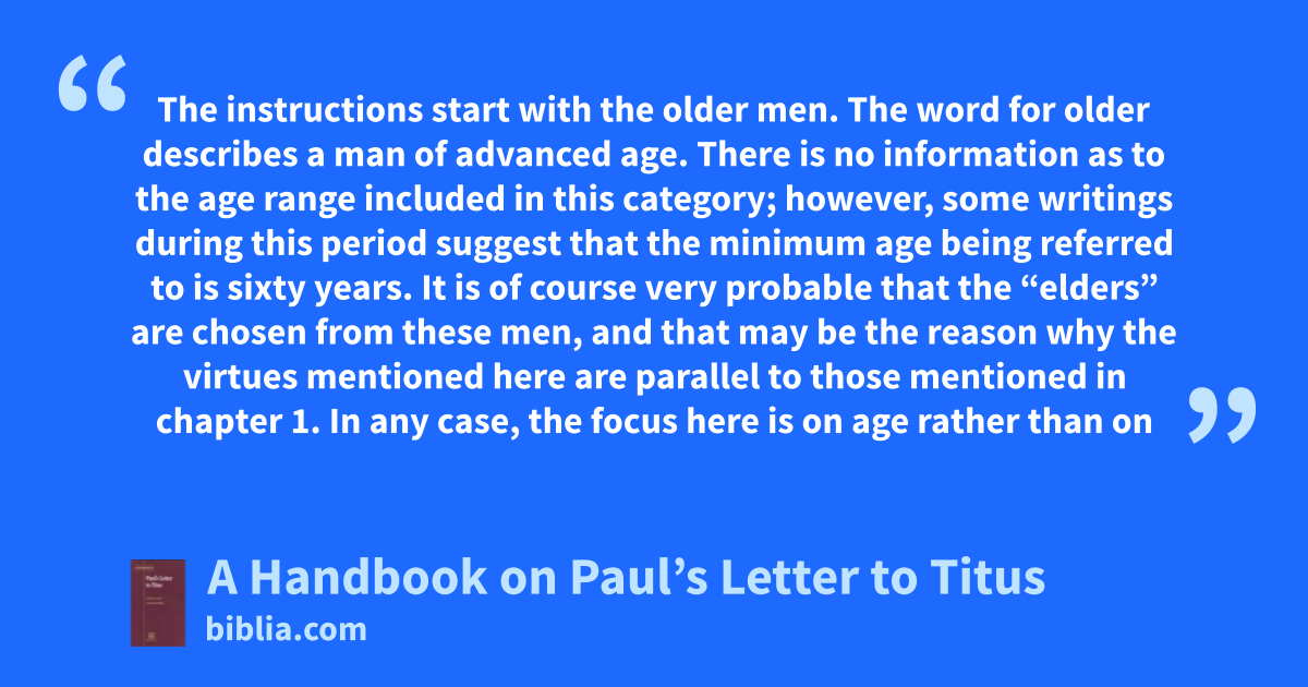 The instructions start with the older men. The word for older describes a man of advanced age. There is no information as to the age range included in this category; however, some writings during this period suggest that the minimum age being referred to is sixty years. It is of course very probable that the “elders” are chosen from these men, and that may be the reason why the virtues mentioned here are parallel to those mentioned in chapter 1. In any case, the focus here is on age rather than on