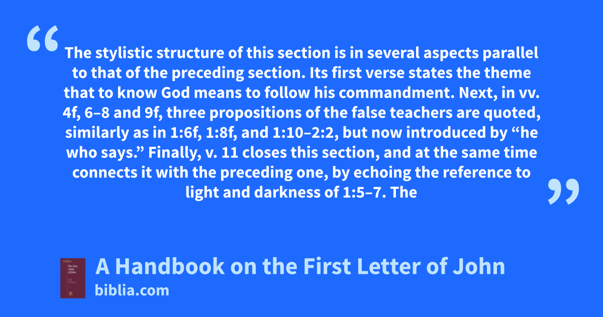 The stylistic structure of this section is in several aspects parallel to that of the preceding section. Its first verse states the theme that to know God means to follow his commandment. Next, in vv. 4f, 6–8 and 9f, three propositions of the false teachers are quoted, similarly as in 1:6f, 1:8f, and 1:10–2:2, but now introduced by “he who says.” Finally, v. 11 closes this section, and at the same time connects it with the preceding one, by echoing the reference to light and darkness of 1:5–7. The