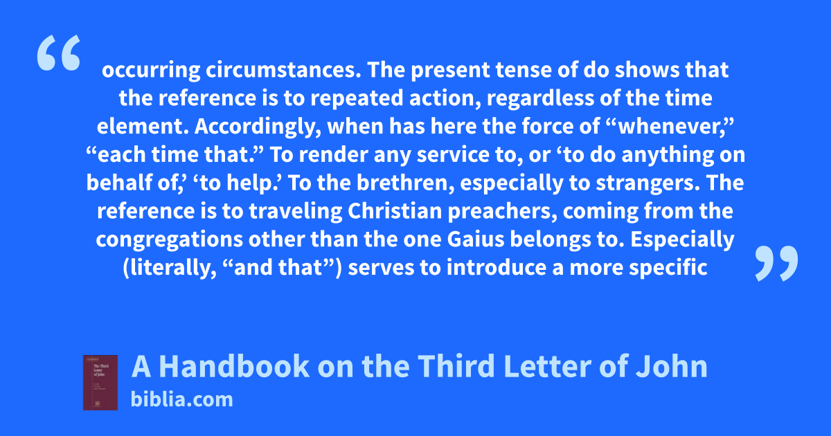 occurring circumstances. The present tense of do shows that the reference is to repeated action, regardless of the time element. Accordingly, when has here the force of “whenever,” “each time that.” To render any service to, or ‘to do anything on behalf of,’ ‘to help.’ To the brethren, especially to strangers. The reference is to traveling Christian preachers, coming from the congregations other than the one Gaius belongs to. Especially (literally, “and that”) serves to introduce a more specific