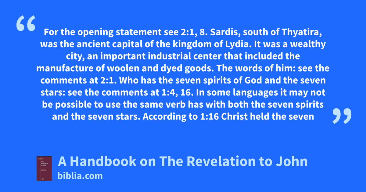 For the opening statement see 2:1, 8. Sardis, south of Thyatira, was the ancient capital of the kingdom of Lydia. It was a wealthy city, an important industrial center that included the manufacture of woolen and dyed goods. The words of him: see the comments at 2:1. Who has the seven spirits of God and the seven stars: see the comments at 1:4, 16. In some languages it may not be possible to use the same verb has with both the seven spirits and the seven stars. According to 1:16 Christ held the seven