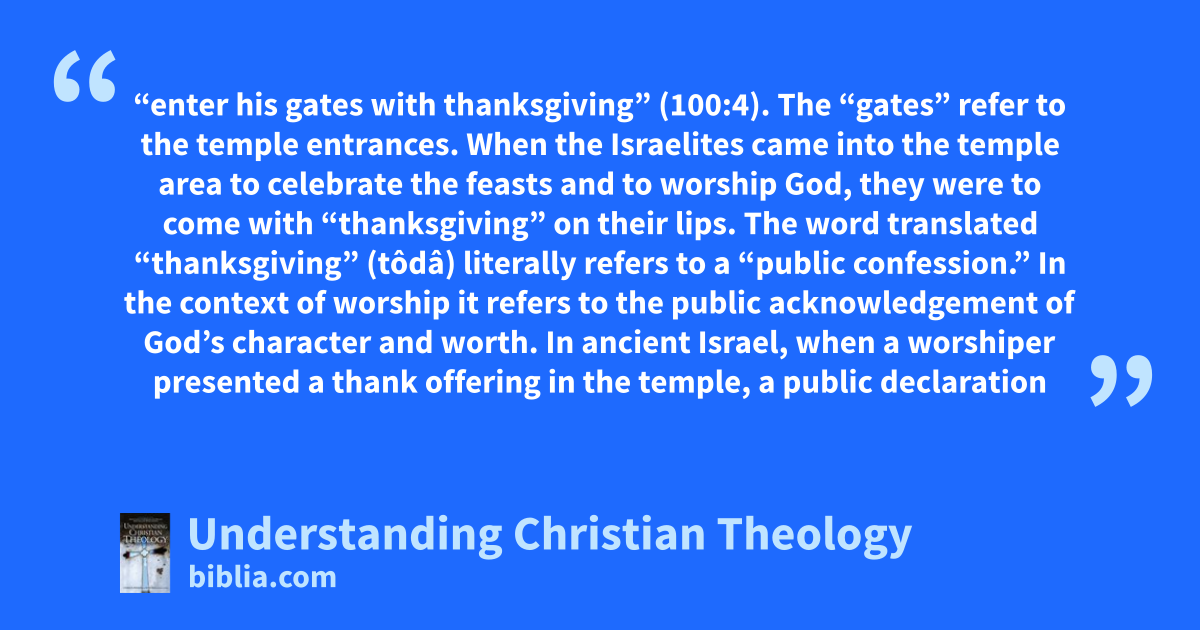 “enter his gates with thanksgiving” (100:4). The “gates” refer to the temple entrances. When the Israelites came into the temple area to celebrate the feasts and to worship God, they were to come with “thanksgiving” on their lips. The word translated “thanksgiving” (tôdâ) literally refers to a “public confession.” In the context of worship it refers to the public acknowledgement of God’s character and worth. In ancient Israel, when a worshiper presented a thank offering in the temple, a public declaration